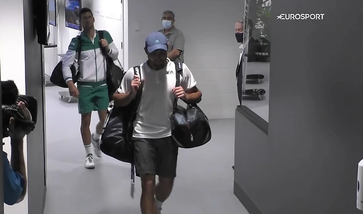 11:37 Тренер Джоковича Горан Иванишевич в подтрибунке показывал кому-то средний палец. А ребята уже идут на корт.