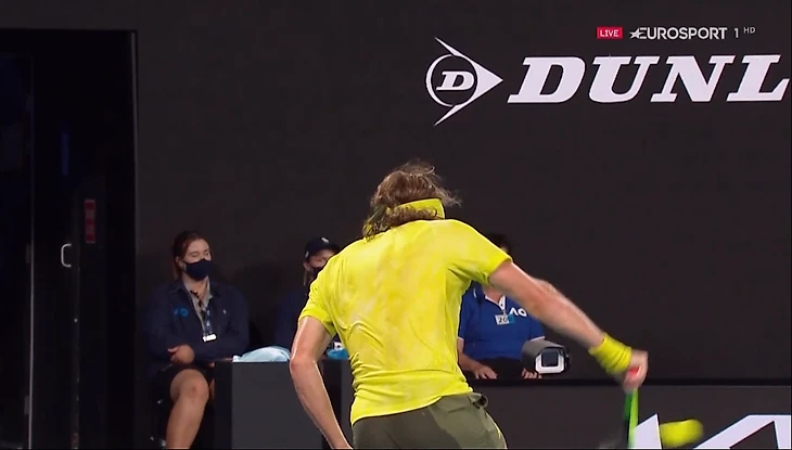 Шикарный удар слева по линии от Медведева , но у Стефаноса опять беда с бэкхендом. На первом мяче слева подошел неудобно , мяч близко прижал к корпусу , а когда мяч прижат близко , его очень сложно направить туда , куда хочешь. Повезло , что Медведев не стал атаковать . Второй мяч тоже выскребал из очень низкой точки (дал мячу слишком опуститься), в итоге получился наброс под мощнейший удар слева от Даниила.