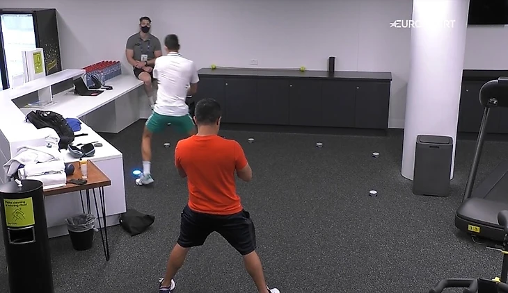 11:33 Гимн спели, Джокович закончил разминку интересным упражнением. Его физио зажигал огоньки на полу, и Новак должен был подбегать к ним и имитировать удар.