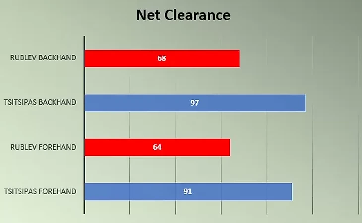 Стефанос хорошо подавал и надежно действовал с бэкхенда. Интересно, что, если верить статистике сайта tennistonic, то что слева, что справа Циципас пробивал в среднем почти на 27-29 см выше над сеткой, чем Рублев.