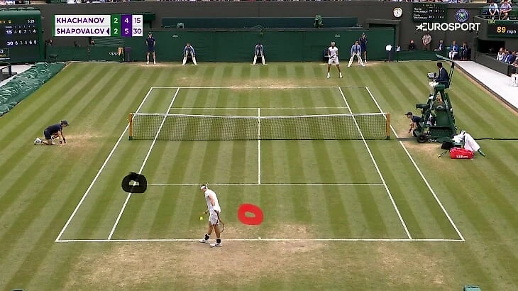 Но на брейк-пойнте при счете 5:5 в третьем сете Карен такую подачу принял примерно в круг, обведенный красным. За счет этого он не дал Шаповалову прямую линию для атаки, ему нужно было самостоятельно создавать угол – причем не из самой удобной позиции, потому что прием вышел глубоким.