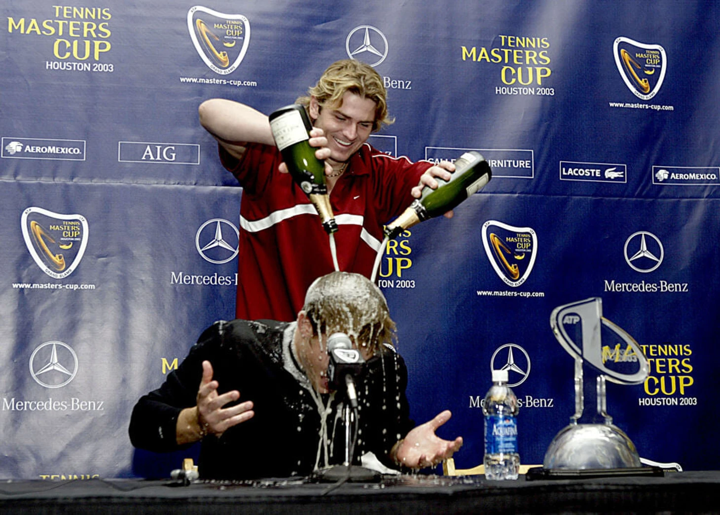 Фиш обливает Роддика шампанским в честь его звания №1 по итогам сезона-2003