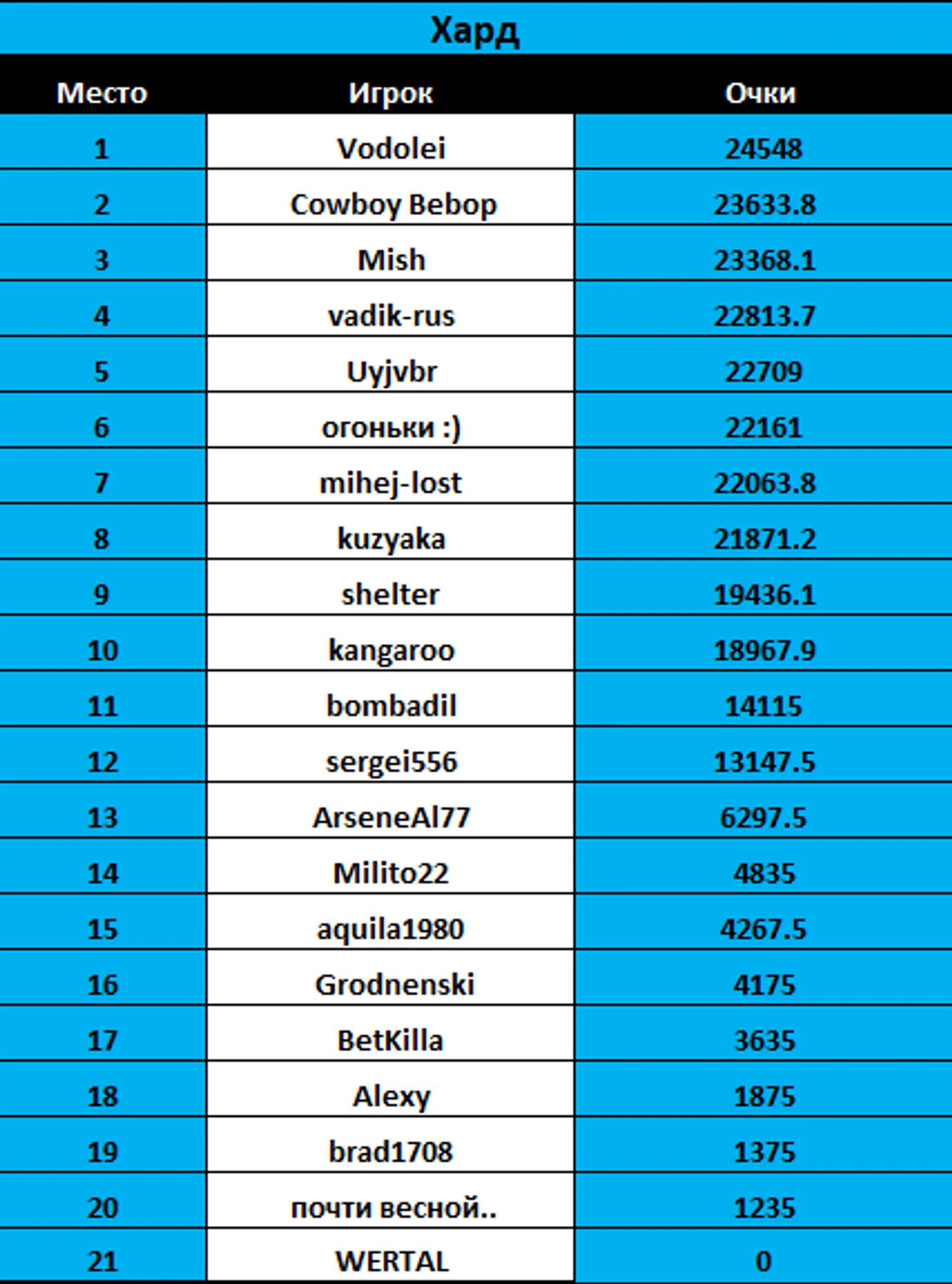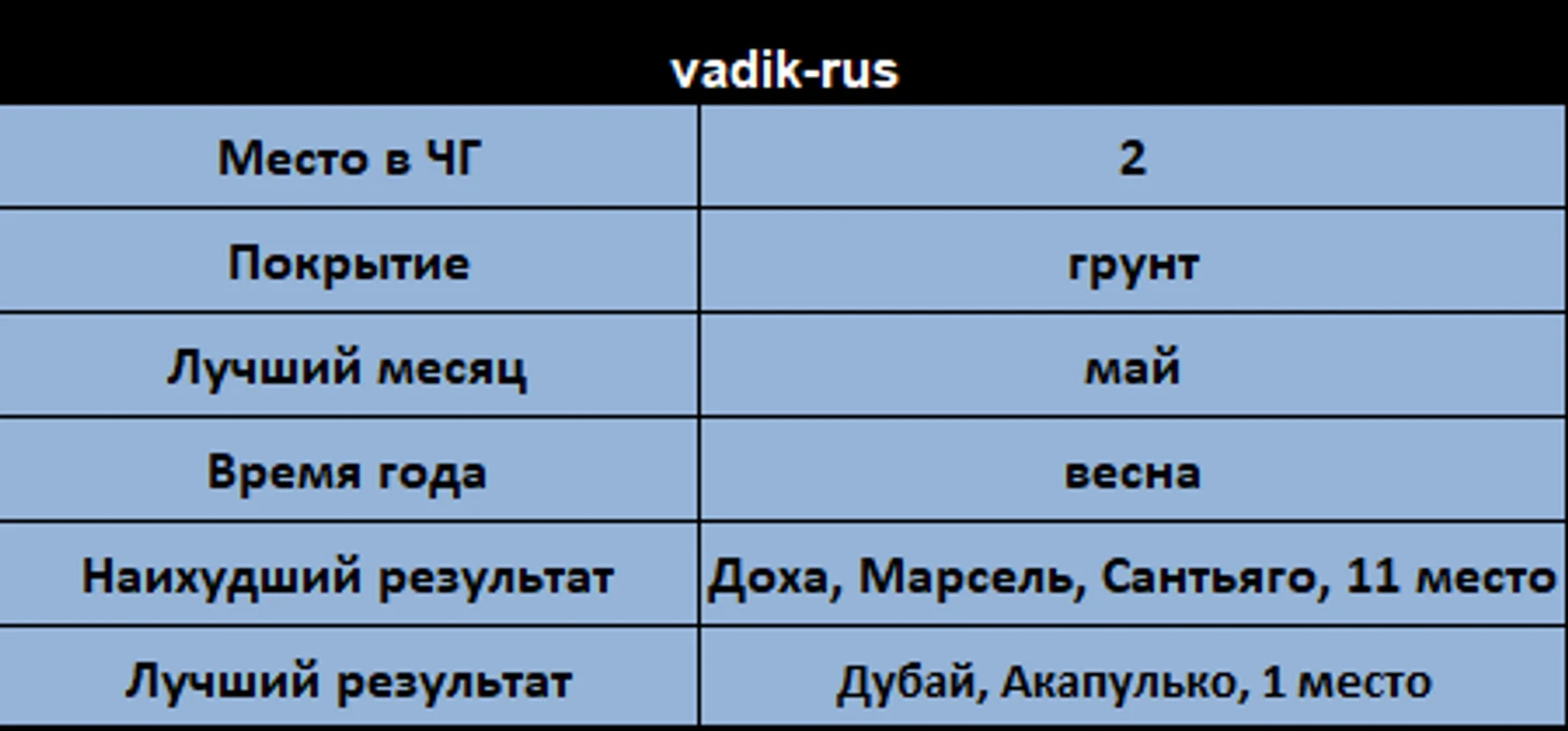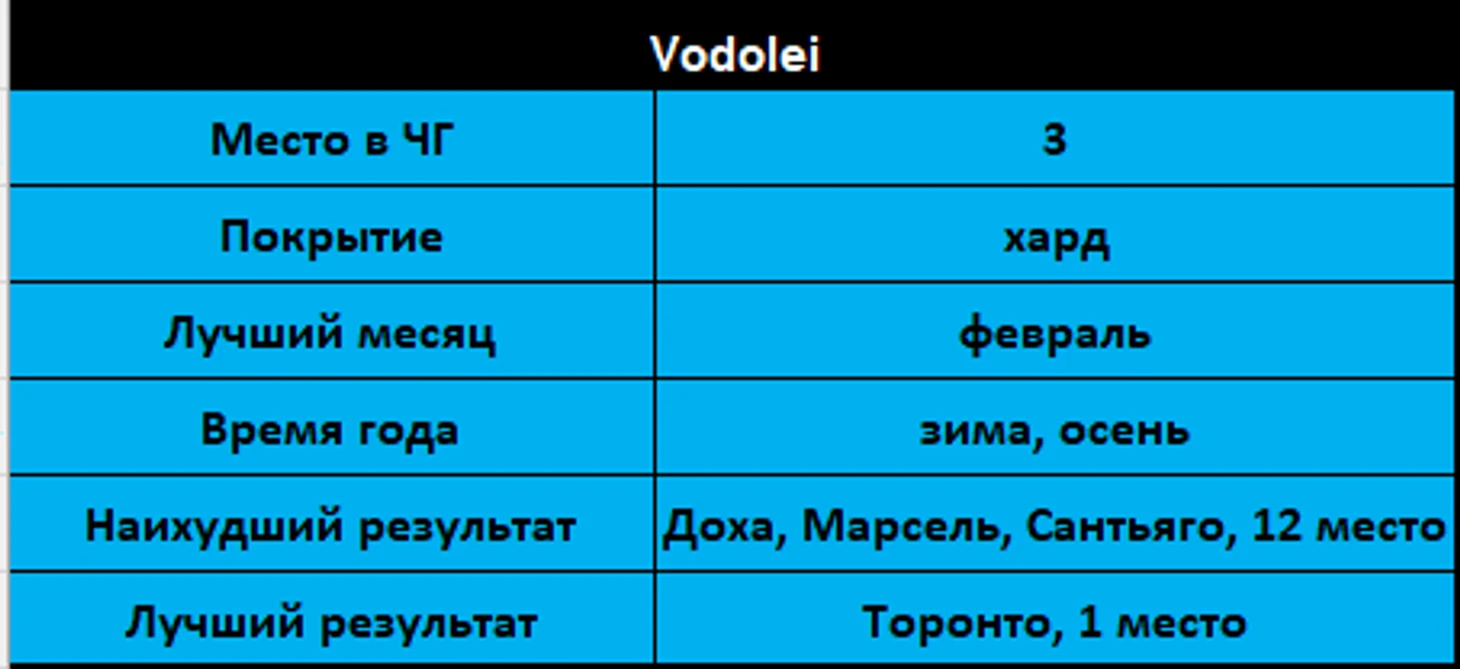 На харде, на покрытии котором мы играем большую часть сезона, лидирует Vodolei (в сумме баллов числа не целые, потому что были недели, где игрались и хардовые, и грунтовые турниры одновременно)
