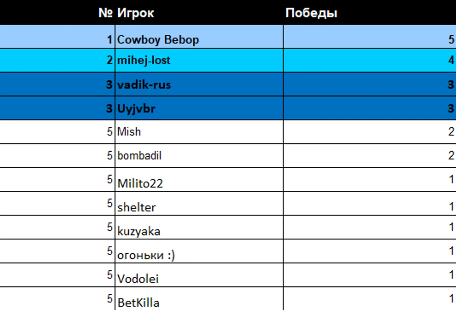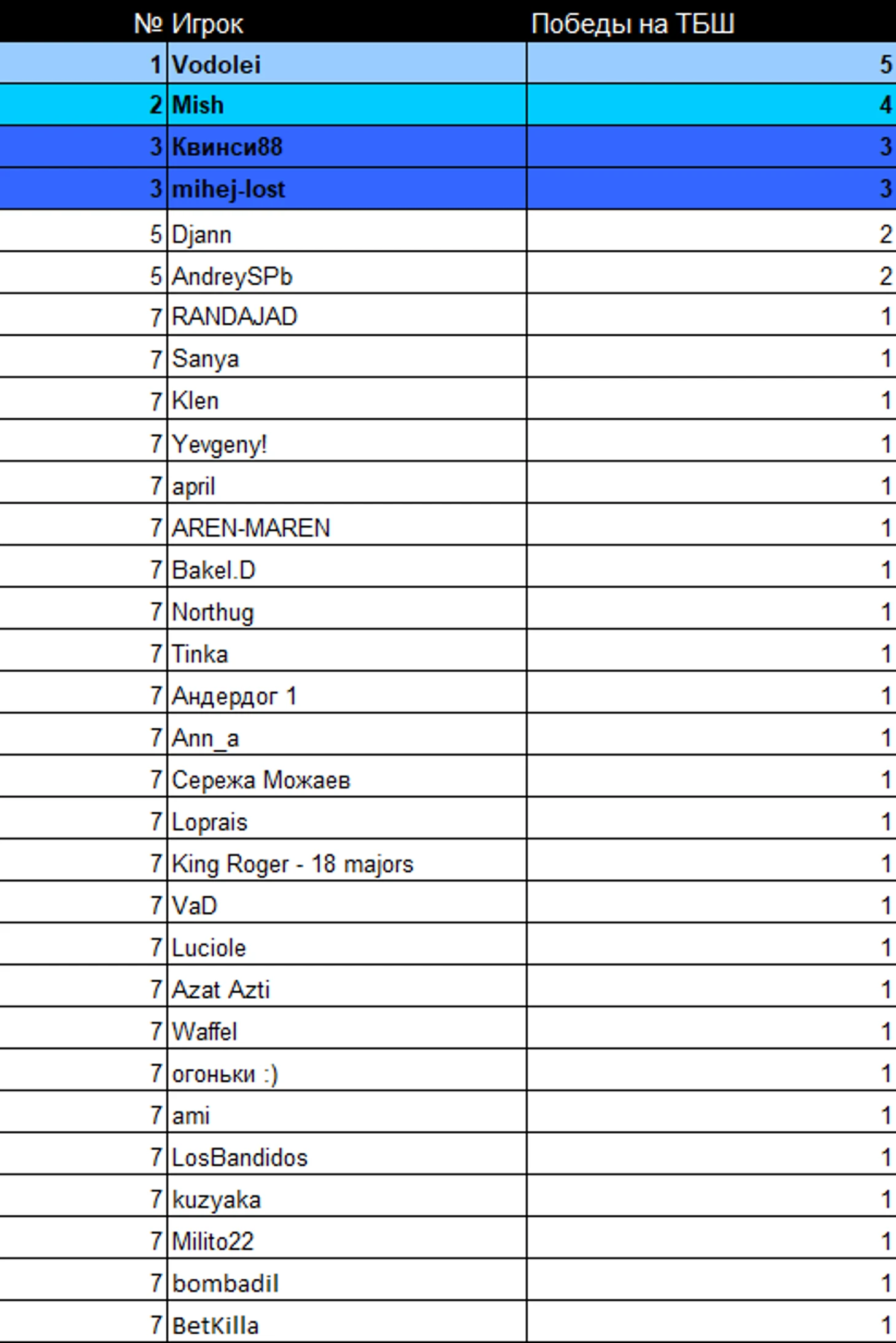 Общий зачет турниров ТБШ. Здесь мы видим, что лидирует Vodolei c 5 победами на турнирах ТБШ, далее идут Mish с 4 победами и Квинси88 с mihej-lost, у них по 3 шлема.