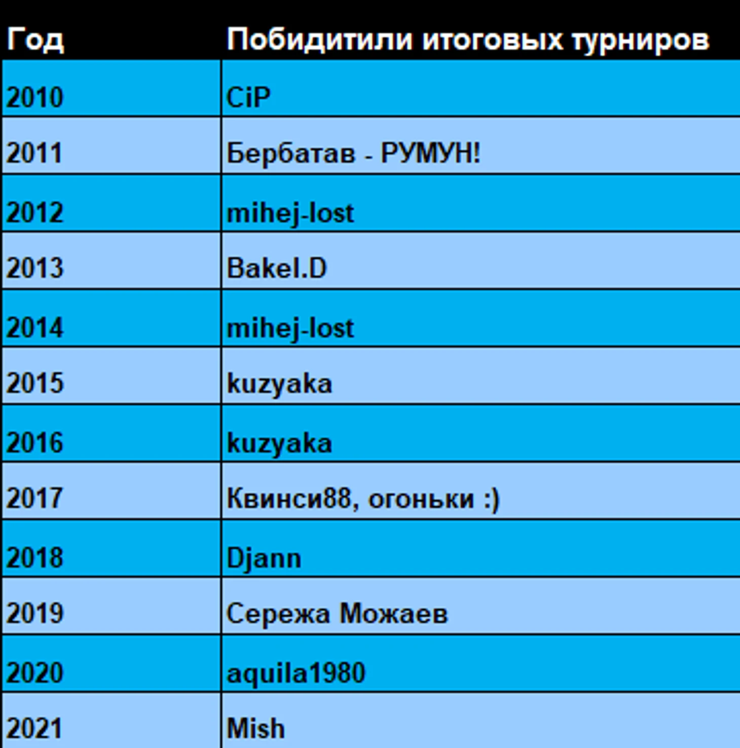 Отдельно выделим победителей итоговых турниров по годам. В этом сезоне турнир выиграл Mish.