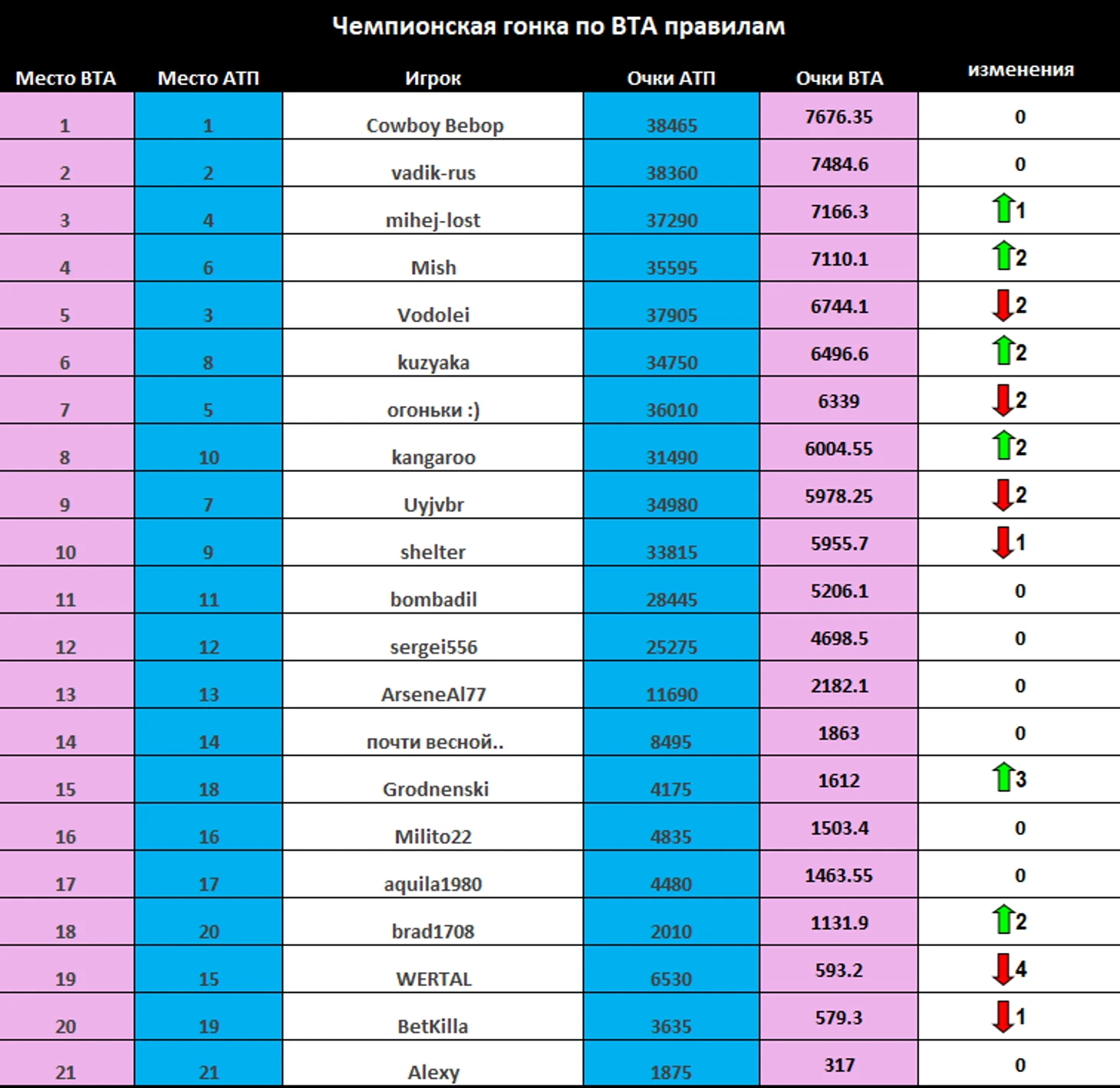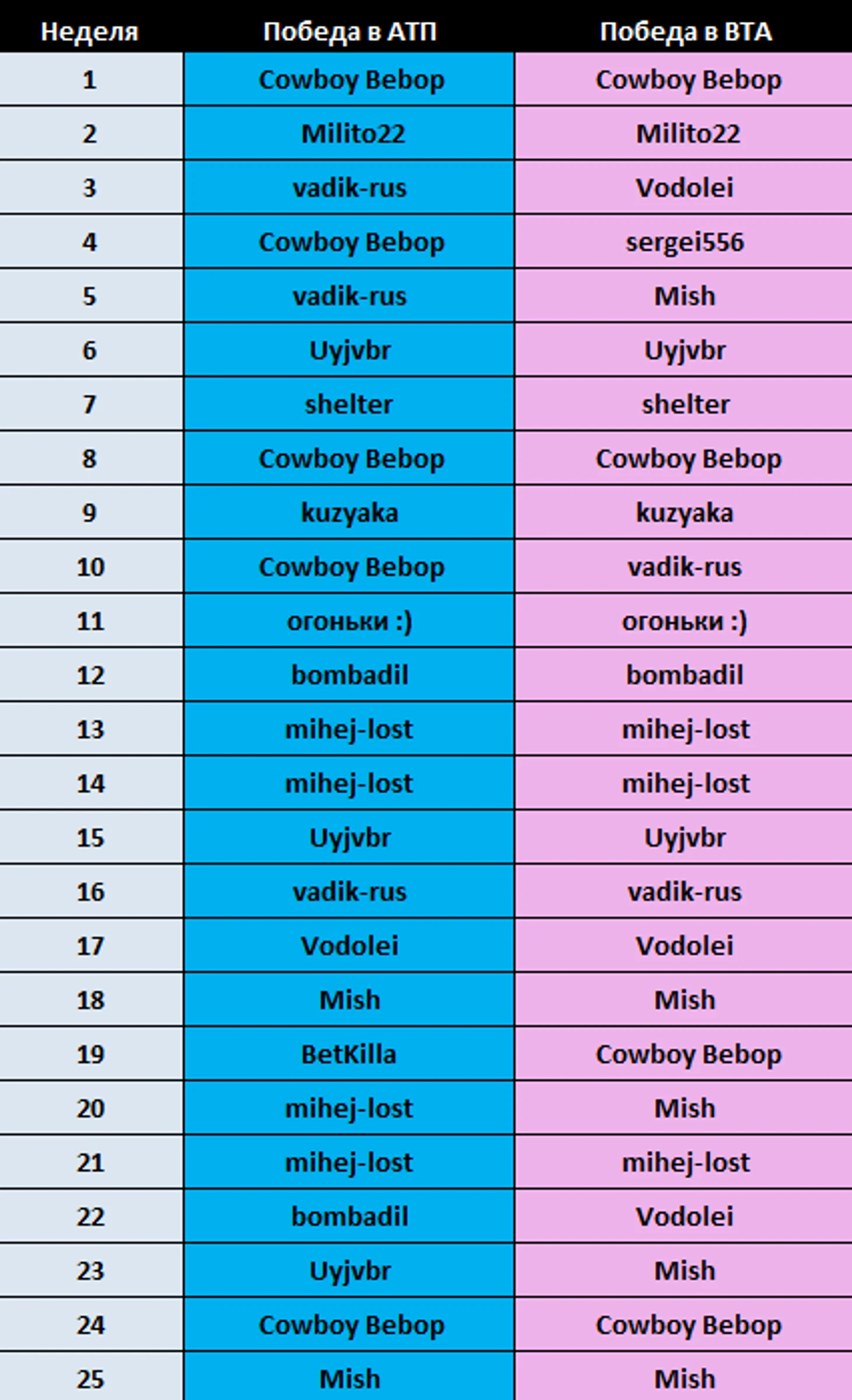 Если в АТП наибольшее количество побед одержал Cowboy Bebop, то по правилам ВТА больше всего у Mish.