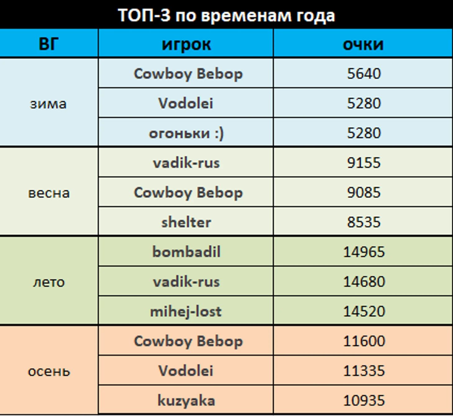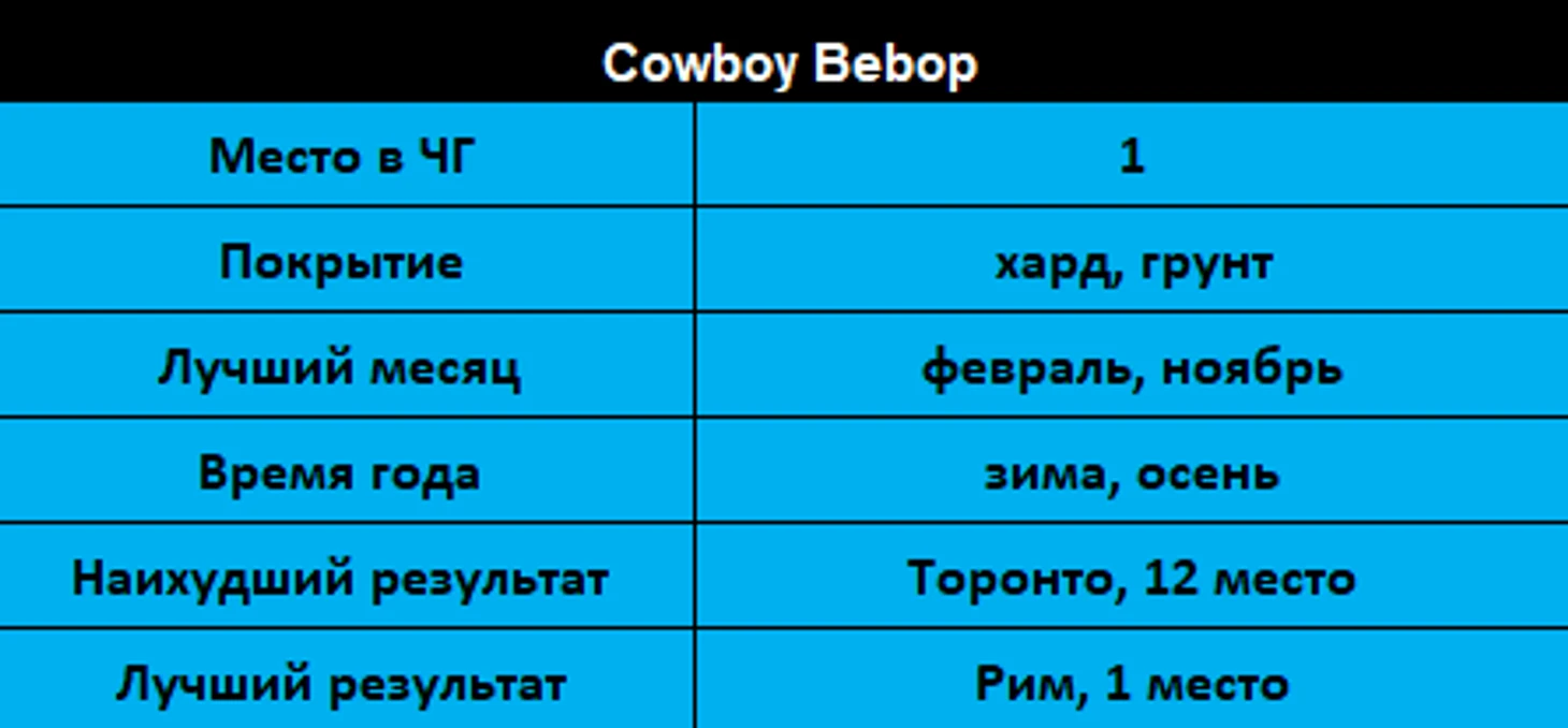 А сейчас узнаем, кому какое больше подходит время года. Сразу можно увидеть, что Cowboy Bebop был в числе лидеров во всех временах года кроме лета.
