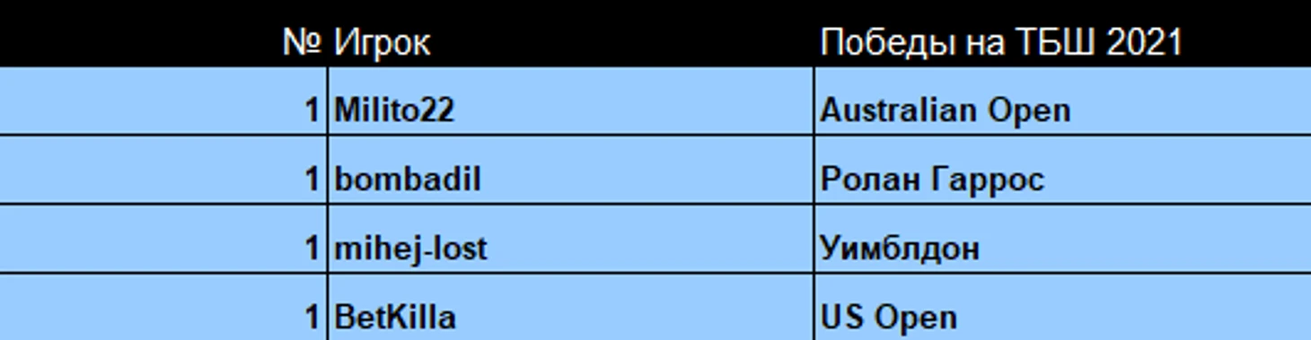 Далее рассмотрим, кто же останавливался в шаге от победы на ТБШ. В этом сезоне четырём игрокам не удалось выиграть ТБШ, они были совсем близки к победе…