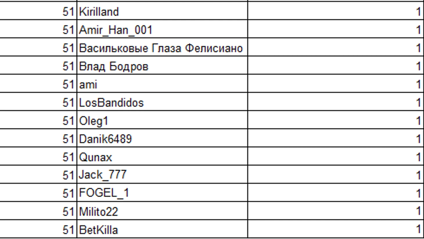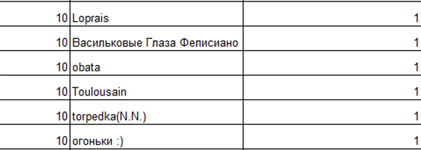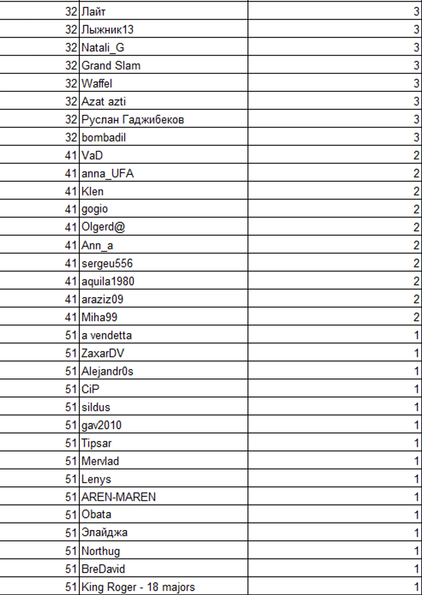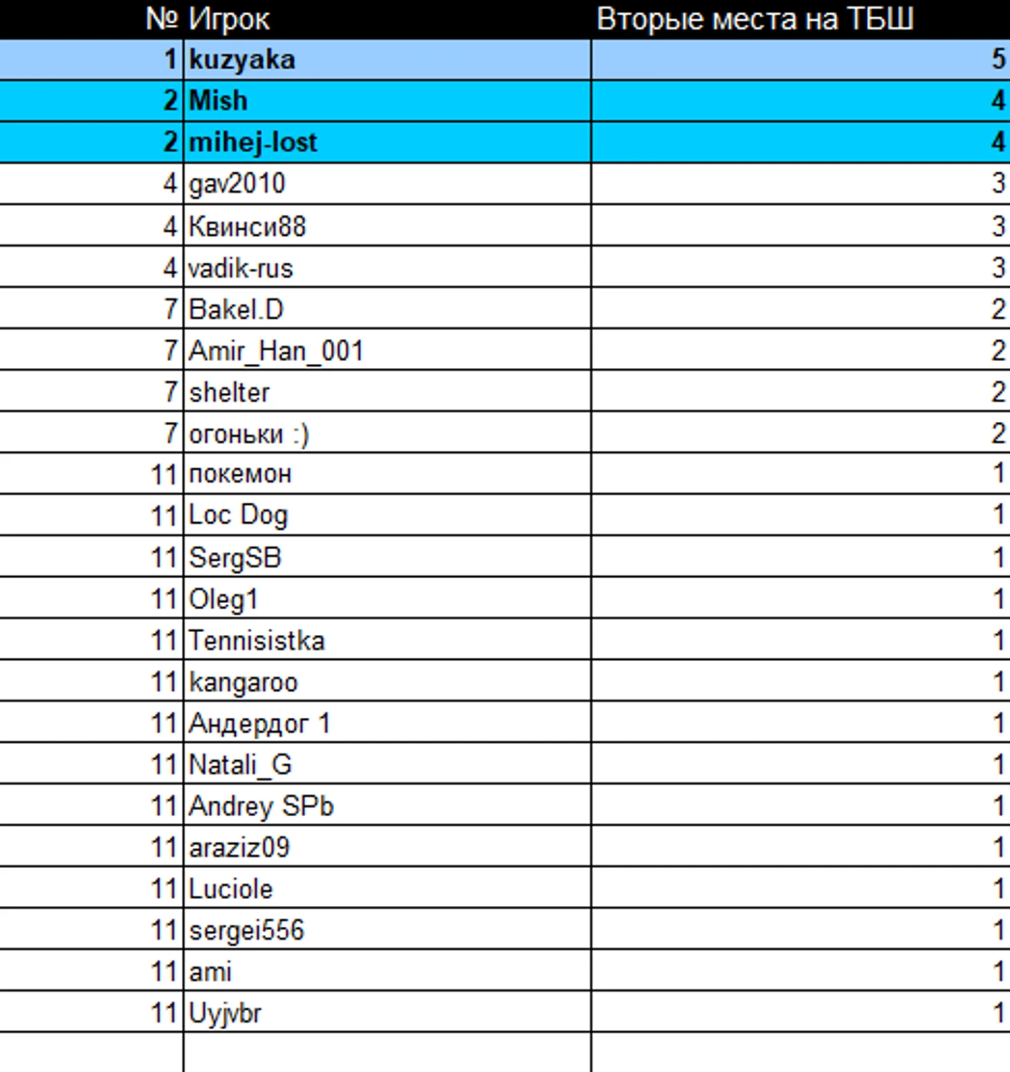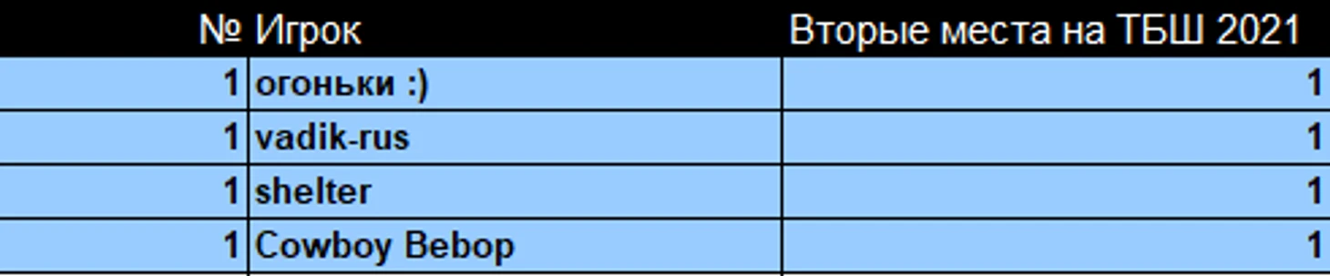 Теперь посмотрим на общую таблицу вторых мест на ТБШ за всё время.
