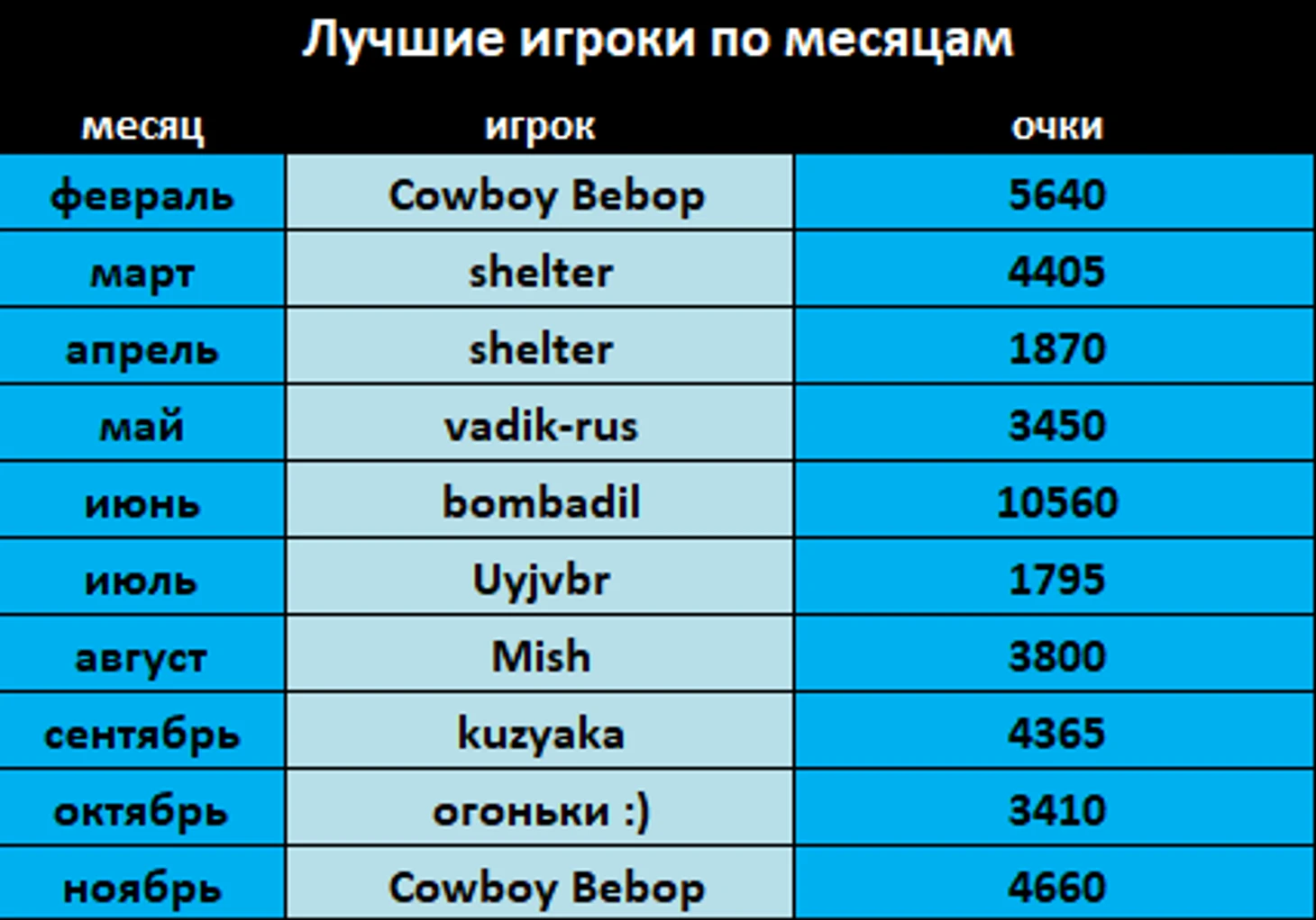Только двум игрокам удалось лидировать в двух месяцах - shelter и Cowboy Bebop. Нельзя не отметить bombadil, который набрал наибольшее количество очков по итогом июня.
