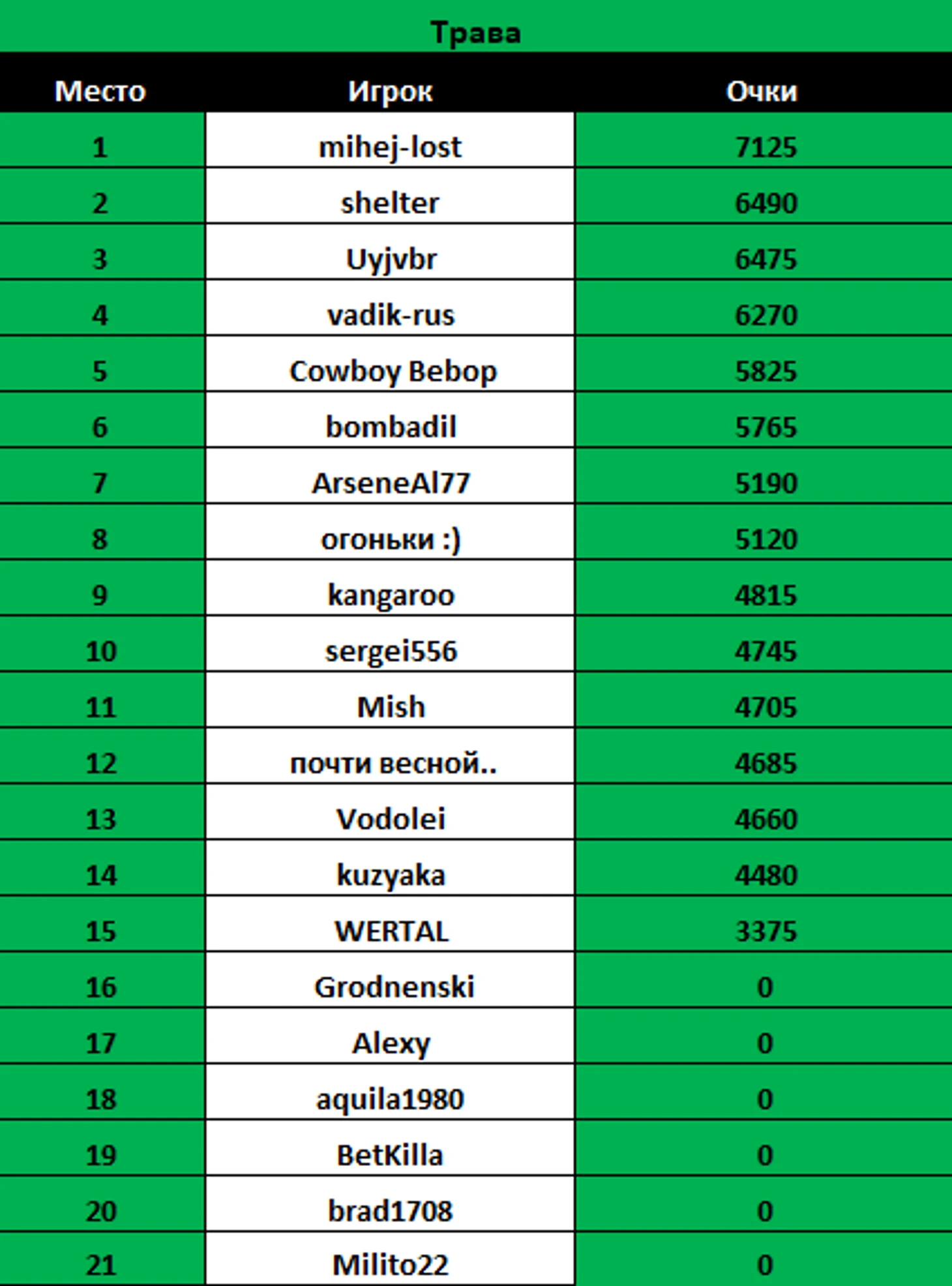 Теперь перейдём к траве, не смотря на то, что травяной сезон у нас самый короткий, тут можно наблюдать ярко выраженного лидера - mihej-lost.