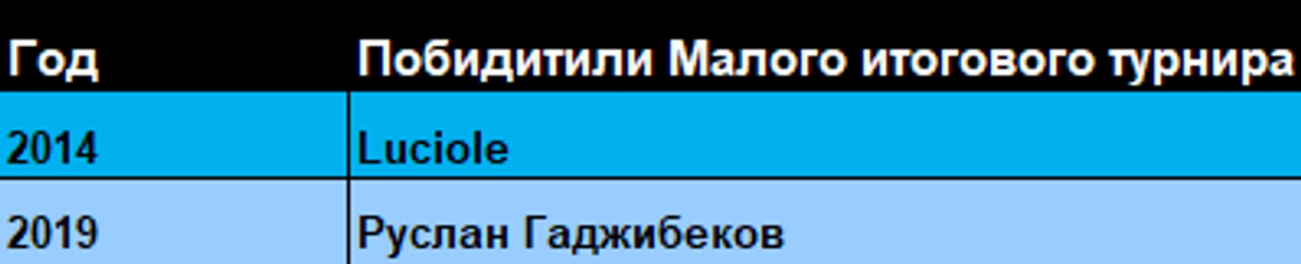 Теперь назовём отдельно победителей малых итоговых турниров по годам. не смотря на то, что он состоялся у нас всего дважды на данный момент
