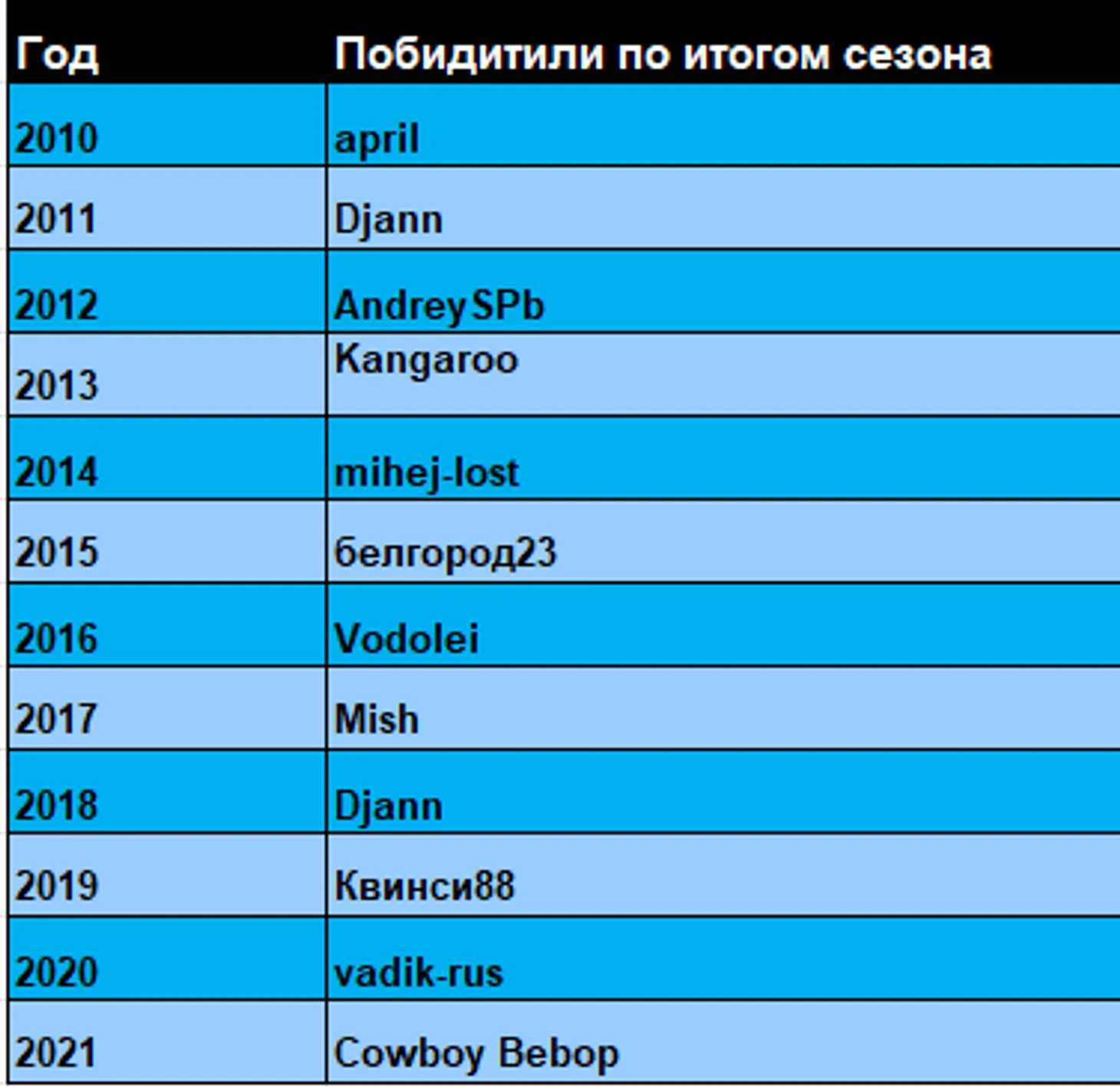 Переходим к заключительной нашей таблице, на данный момент за все 11 сезонов в фентази итоговую победу в общем зачете у нас смогли одержать 10 человек. По итогам сезона 2021 чемпионом фентази уже во второй раз становится Сowboy Bebop. Теперь Рекорд по числу побед на конец сезона делят Djann и Сowboy Bebop.