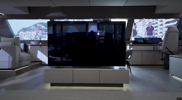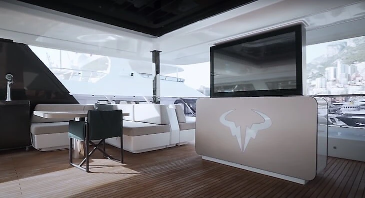 На флайбридже у Надаля установлен очередной телевизор – на этот раз на тумбе с его логотипом в виде бычьих рогов, разработанного Nike.