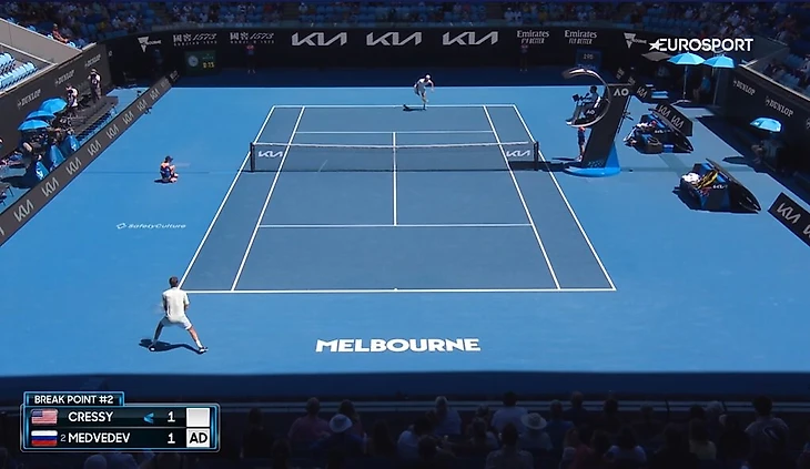 Кроме того, у Кресси очень агрессивная тактика на приеме – он даже на первом мяче стоит вплотную к задней линии и стремится пробить посильнее. Чтобы получилось навылет или так, что дальше можно ворваться к сетке. Большую часть матча эта тактика не работала, потому что Медведев слишком хорошо подает.