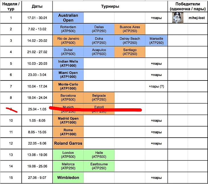 P.S. У меня небольшие сомнения по поводу травяного сезона. У женщин все просто, там одна неделя без 500-к, она идет сразу после РГ, ее и убрал. У мужчин таких недели две: сразу после РГ и прямо перед Уимом. Какую лучше оставить?