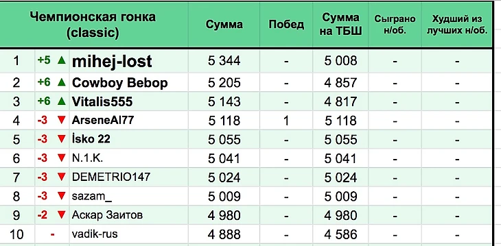 1. Чемпионские гонки теперь учитывают баллы на текущих незавершенных турнирах, а также появился столбик с динамикой мест относительно прошлой игровой недели. Там же есть графы, посвященные "необязательным" турнирам, чтобы вы смогли оценить, как это может выглядеть. Правда пока они пустые, но смысл, думаю, будет понятен :)