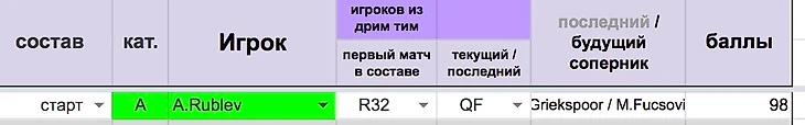 2. Графа "последний/будущий соперник" на листах турниров теперь полностью привязана к сетке турнира на том же листе. Это позволило, во-первых, наконец-то сделать так, чтобы оно нормально работало без оглядки на сайты, а во-вторых, обозначать неопределившегося соперника. Пример: