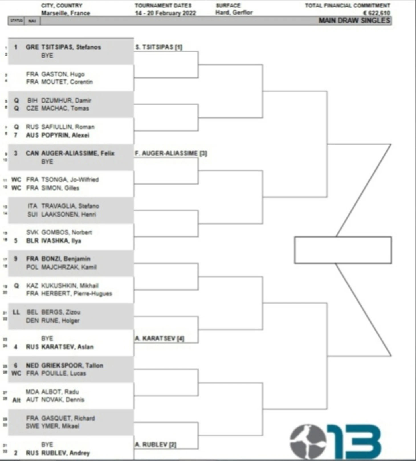 Первые три сеянных, точно таких же, что были и в Нидерландах. На том турнире Феликс Оже-Альяссим взял титул, в финале переиграл Стефаноса Циципаса, а Андрея Рублева обыграл в полуфинале. Что-то говорить о последних выступлениях Аслана сложно. 1-ый сеянный в Пуне и вылет сразу, в Роттердаме тоже имел неплохой посев, но также проиграл в первом своем матче.