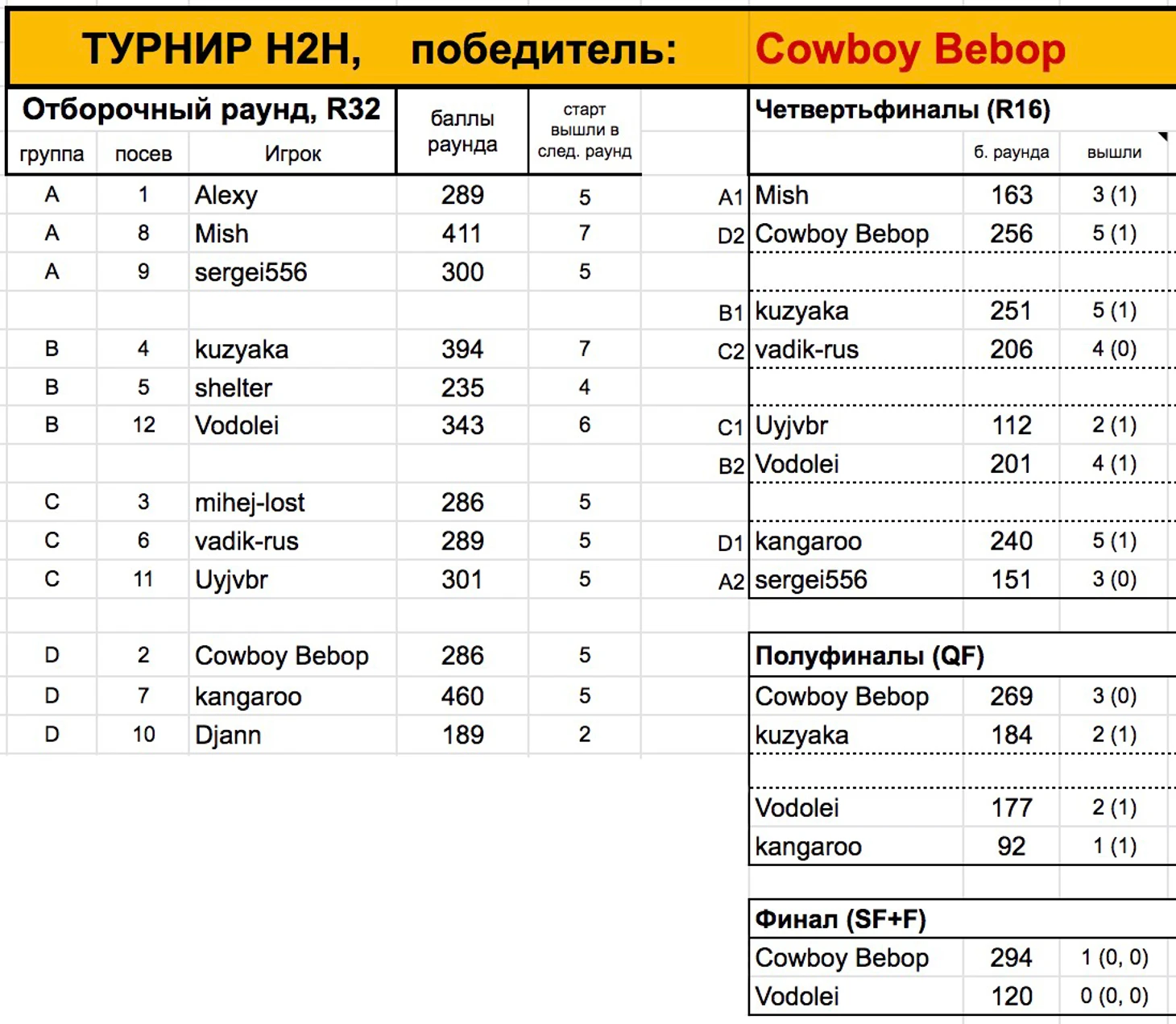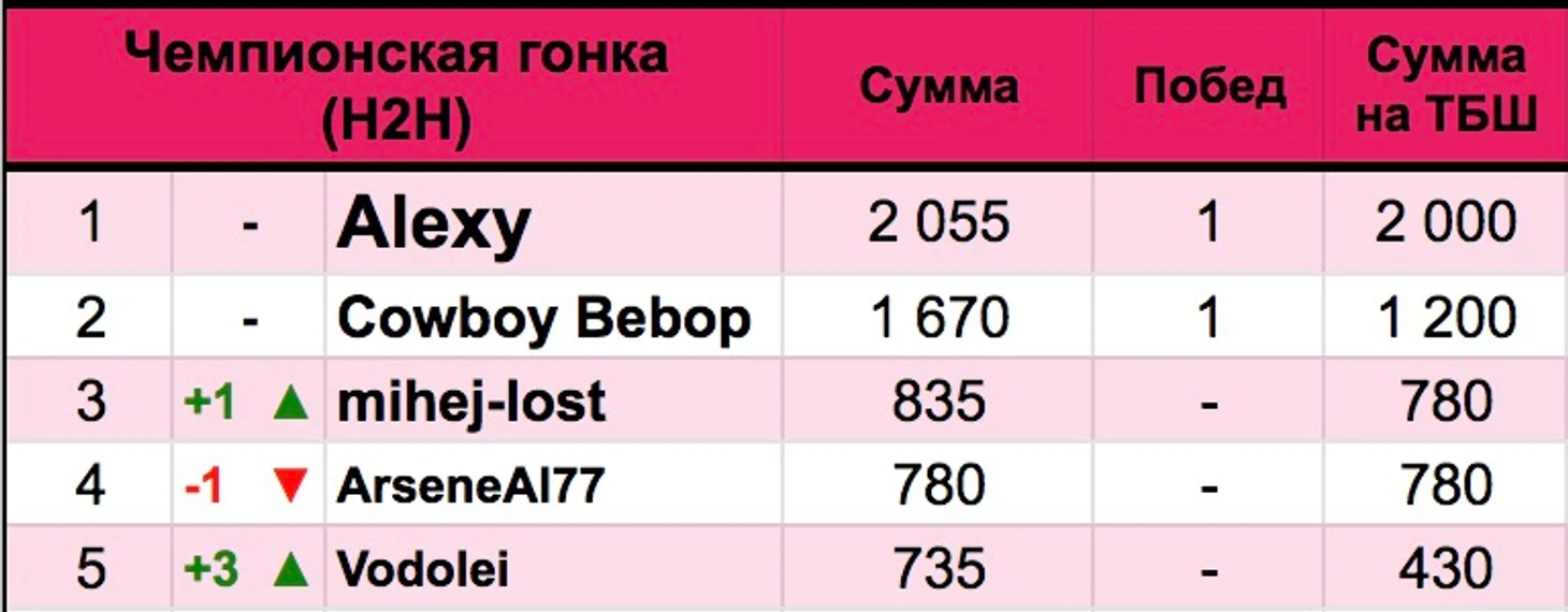Зато в H2H у нас наконец-то другой победитель! Ковбой Бибоп лично оставил за бортом чемпиона основы Миша в 1/4, в полуфинале уверенно обыграл Кузяку, а в финале – Водолея, для которого этот финал стал утешением после не самого удачного основного турнира (8-е место).