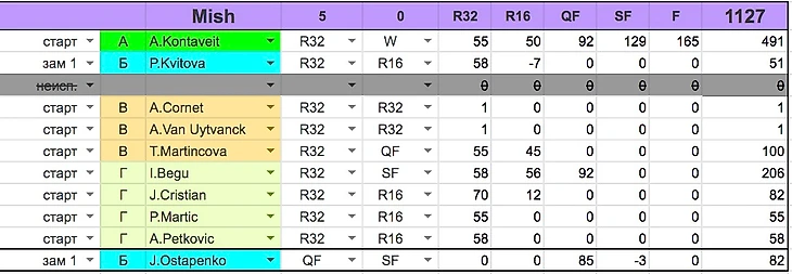 ...но не менее важным стали крайне неудачные замены главных преследователей. Кузяка словила небольшой минус на Остапенко в полуфинале, Ковбой ничего не набрал на Мартинцовой в 1/4, Михей рискнул и заменил чемпионку Контавет на финалистку Саккари (впрочем, это был оправданный риск, с Контавейт в составе Михею бы тоже не хватило совсем чуть-чуть, здесь неудача скорее в том, что лучше было сделать замену другую в предыдущем раунде, сохранив чемпионку в составе), а Вадик-рус и вовсе обошелся без замен. У Миша же замена сработала – Остапенко принесла неплохие 82 балла.