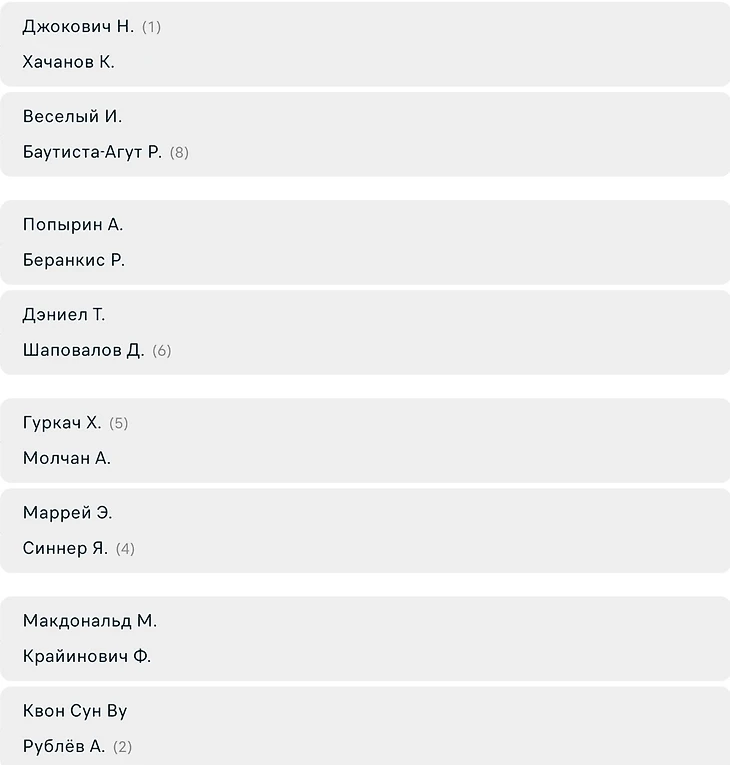 Теперь стоит рассказать о том, как первый круг преодолели теннисисты из России. Аслан Карацев снова начал очень плохо. Седьмая ракетка турнира, большие надежды и полный провал. Первый сет против Маккензи Макдональда мог забирать Аслан, он имел целых шесть брейкпоинтов. Реализовать так их и не смог, а вот теннисисту из Америки хватило двух попыток, так он это ещё и сделал в одиннадцатом гейме - спасаться было поздно. На вторую партию уже вышел поникший Аслан и начал со счета 0-4. Ему удалось даже сделать счет 3-4, но все равно Маккензи смог довести такой перевес до итоговой победы 6-3. Аслан в феврале принимал участие в четырех турнирах, но лишь однажды смог преодолеть один раунд. Грустная статистика...Карен Хачанов провел тоже не самый простой матч против Алекса де Минуара. Первый сет начал Карен уверенно и захватил перевес в три гейма. Несмотря на обострение борьбы, счет стал 4-3, российский спортсмен взял партию 6-3. Следующая партия уже показала характер австралийца. Он смог быстро сделать обратный брейк, а затем ещё раз взять чужую подачу. Тут уже Хачанов сделал обратный брейк, а потом забрал и одиннадцатый гейм на чужом мяче. Отличный шанс закончить матч, но очередным обратным брейком ответил Алекс. На тай-брейке он не оставил и шанса своему сопернику, разгромив его 7-1. Третий сет лишь совершил обмен брейков в третьем и четвертом гейме, а дальше теннисисты шли к тай-брейку. Игроки остановились в шаге от него т.к. удалось Карену сделать брейк и забрать гейм на чужом мяче, а он оказался решающим. Очень непростая победа, а впереди матч против Новака Джоковича. Андрей Рублев преодолел первый раунд переиграв в сухую Дэна Эванса. Партии получились упорными, но все-таки теннисист из России на классе взял сет 6-4; 7-5.