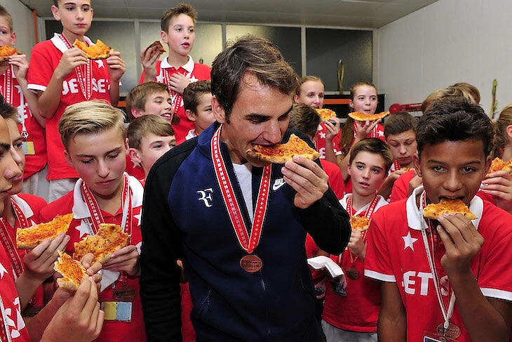 Федерер обожает вкусно поесть. С тех пор, как он в 16 лет отказался от вегетарианства, чтобы есть мясо и становиться сильнее, спортсмен питается практически без ограничений, не забывая о пользе для организма. Особенно Роджер любит пиццу, хоть и не простую, а специально приготовленную для него шеф-поваром Яном Дили. В ней свежий инжир, пармская ветчина, руккола и сырный крем из белого трюфеля. Роджер ест пиццу даже во время турниров и говорит, что она придает ему сил. У чемпиона даже есть традиция раздавать и есть пиццу вместе болбоям после домашнего турнира в Базеле.