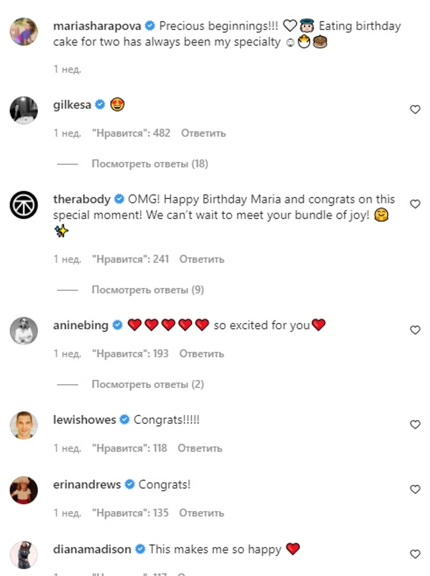 А еще к поздравления присоединились в комментариях под постом Шараповой – набралось аж шесть тысяч! Теплые слова Марии написали коллеги по теннису (например, Елена Веснина) и другие.