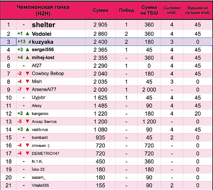 В H2H лидер по-прежнему Шелтер, а победительница недели Кузяка ворвалась в тройку, прибавив аж 13 позиций!