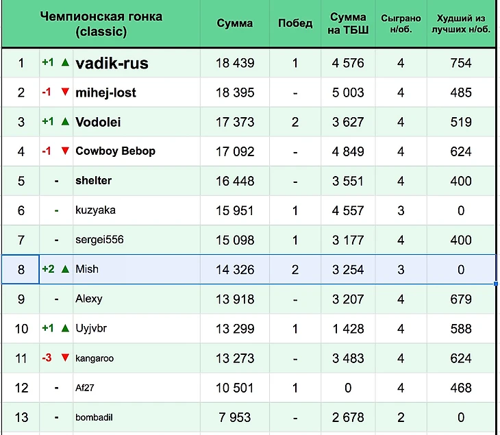 Смена лидера: Вадик, занявший второе место, возглавил гонку, а Водолей благодаря успешному выступлению (4-е место) вошел в тройку. Триумфатор недели Миш наконец-то вошел в 8-ку.