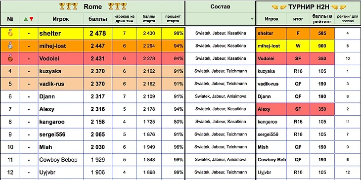 Отметим и здесь интересный казус: все полуфиналисты и финалисты набирали по 488 очков, при том, что количество теннисисток в командах было разным на разных стадиях :) Начиная с полуфиналов все решал результат первого раунда – третий доп. показатель.
