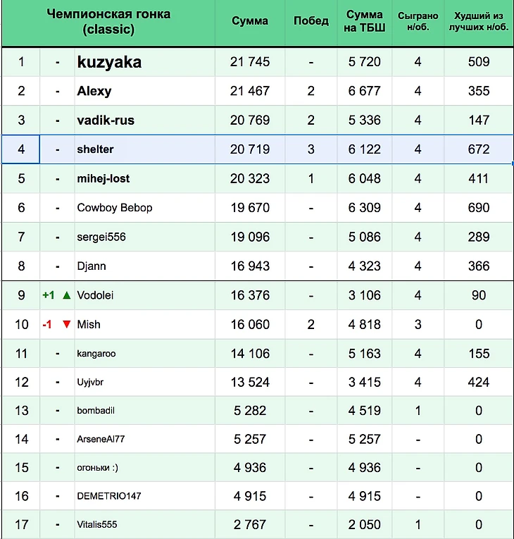 Почти никаких изменений не произошло: лидирует по-прежнему Кузяка. Победитель Шелтер приблизился к тройке.