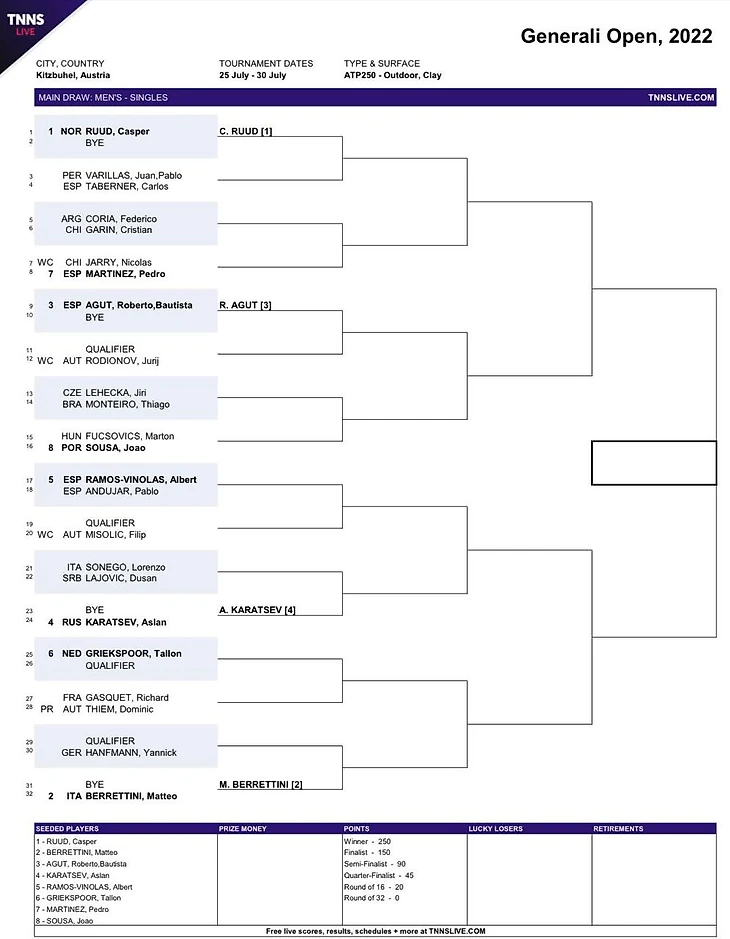 Первым и, пожалуй, наиболее опасным оппонентом для австрийца является итальянец Маттео Берретини, которому Тим уступил на прошлой неделе в Гштааде со счётом 6-1/6-4. Однако вряд ли в этот раз Маттео сможет повторить успех. В Швейцарии Берретини дошёл до финала, уступив в титульном матче Касперу Рууду. На мой взгляд, Доминик сможет сделать правильные выводы после их последней встречи и извлечёт максимум из усталости Маттео.