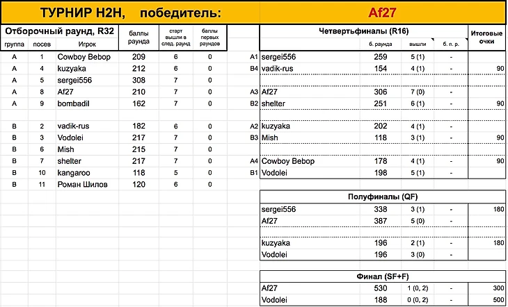 14-ю неделю с крошечным перевесом выиграл Сергей, обойдя на 2 балла Af27, который взял реванш в H2H. Поздравляем обоих с успешным турниром!