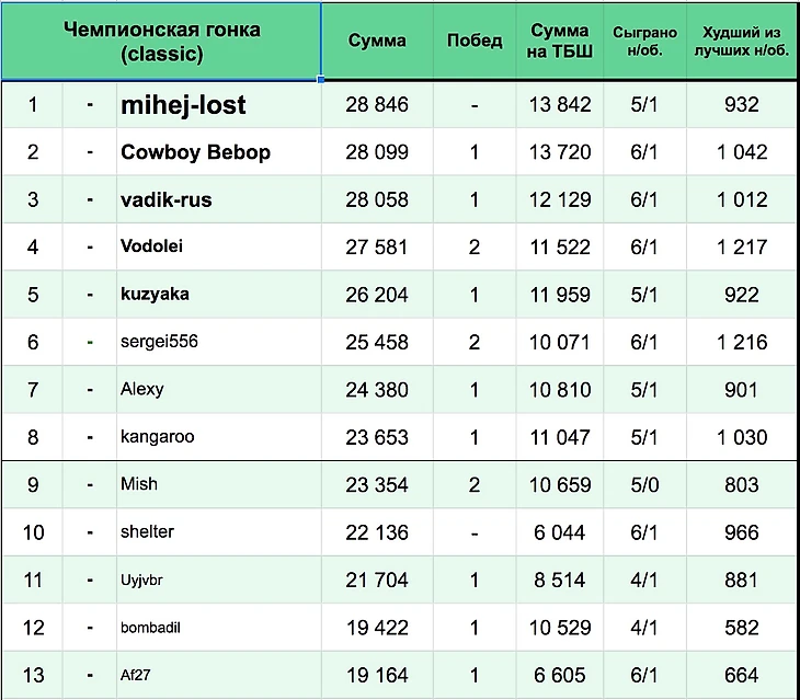 Особых изменений не было: первый по-прежнему Михей (по-прежнему без титула :)), его преследуют Ковбой Бибоп и Вадик, еще сохраняют надежды на первое место Водолей и Кузяка.