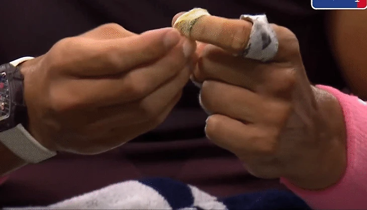Во время перерыва между геймами Рафа позвал на корт врача, чтоб тот постоял рядом с умным видом, пока он срывает лейкопластырь с пальца: