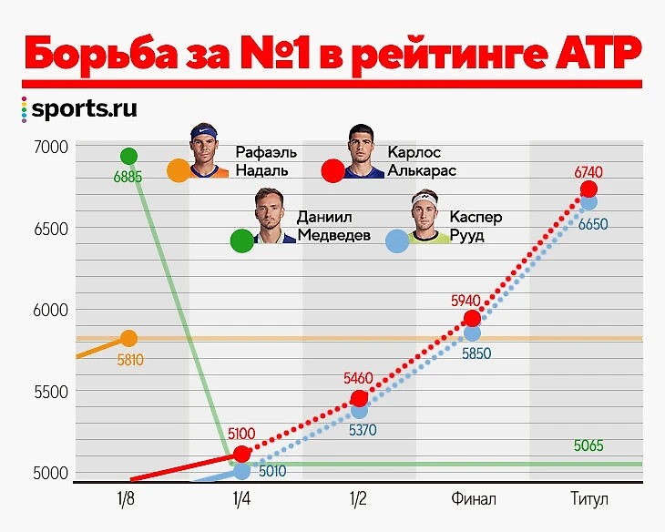 После поражения Надаля Алькарас выиграл тяжелый пятисетовый матч у чемпиона-2014 Марина Чилича – и продолжает борьбу за №1. А Рууд ворвался в четвертьфинал еще в воскресенье.