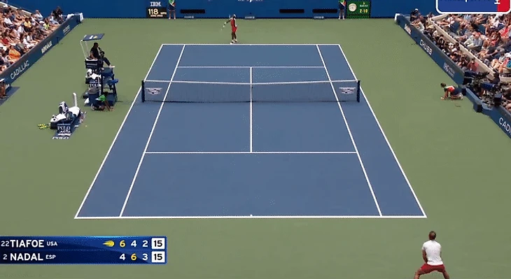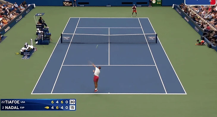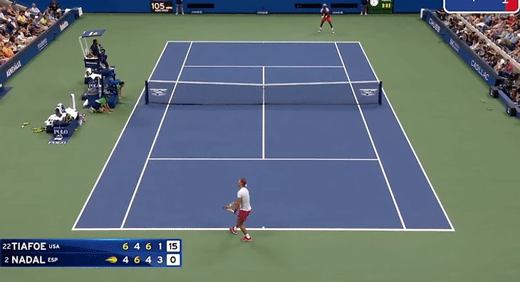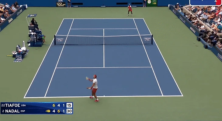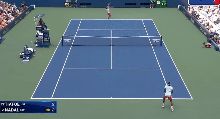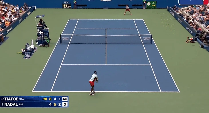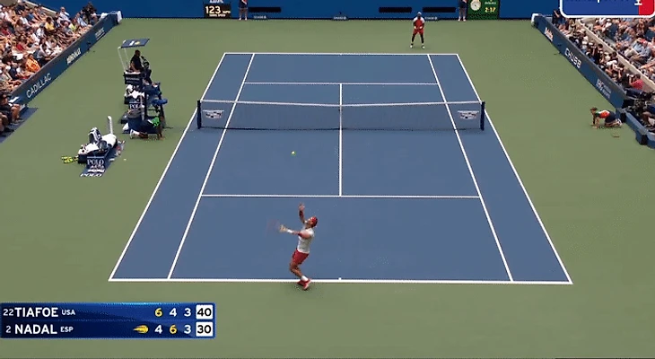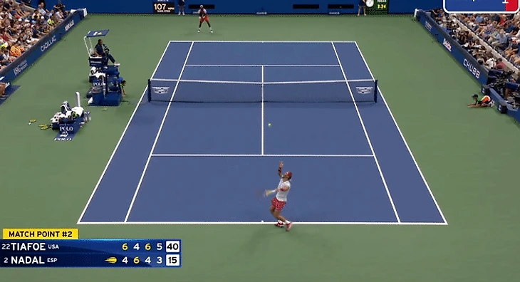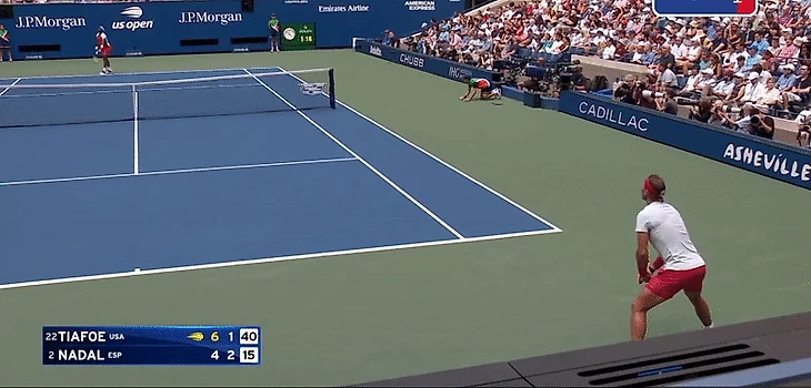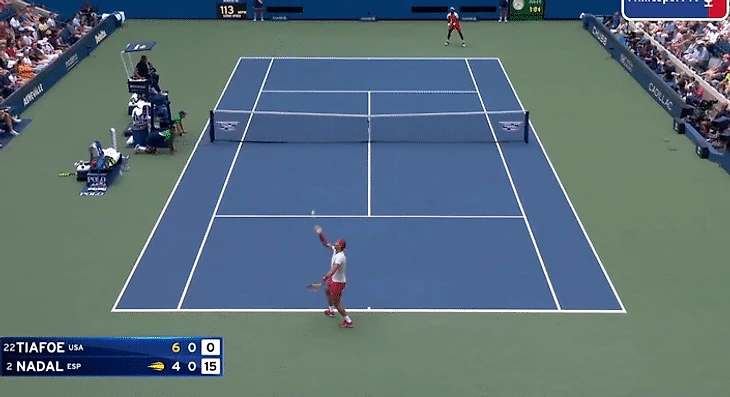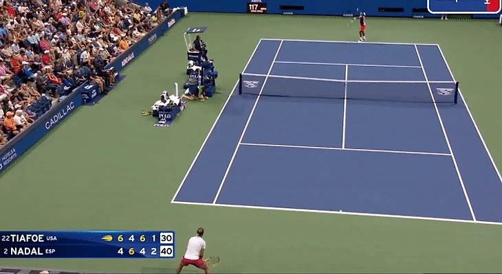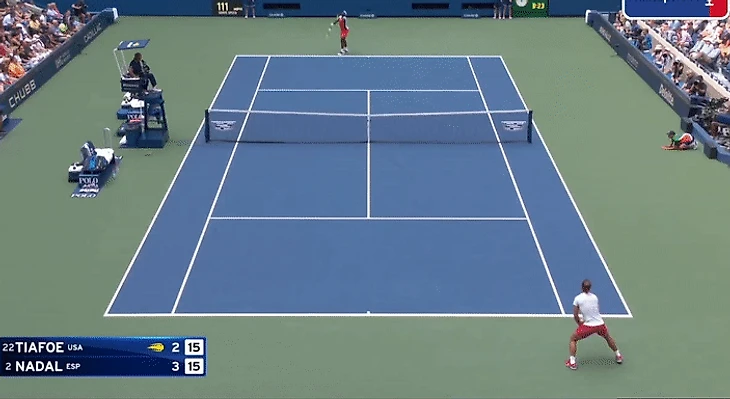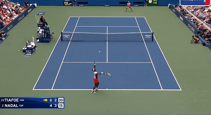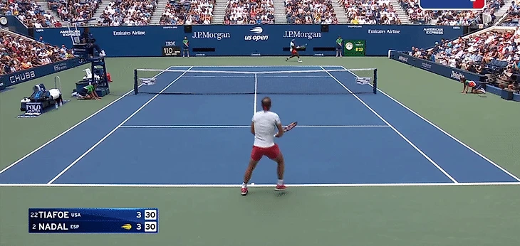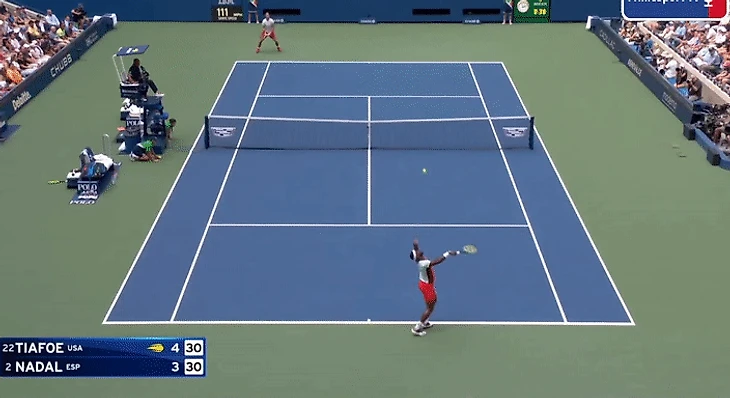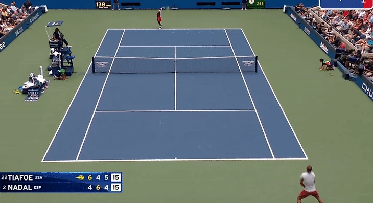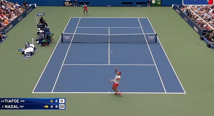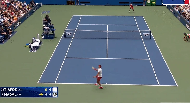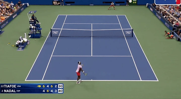 В шестом гейме случился розыгрыш, который наглядно продемонстрировал, почему даже хороший план Рафы из второго сета не будет работать, если исполнителю не хватает быстроты реакции. Прекрасный приём на грани аута подачи американца, форхенд средней паршивости и неплохой бэкхенд по линии. Тиафу отвечает тем же внезапно, но неопасно. Однако Рафе уже настолько не хватает резкости, что он просто не успевает перестроиться из противохода: