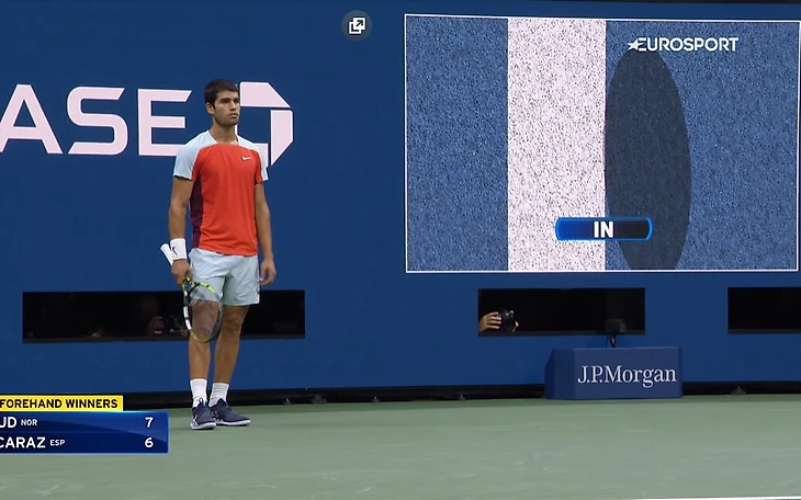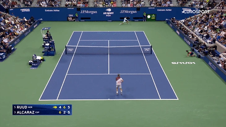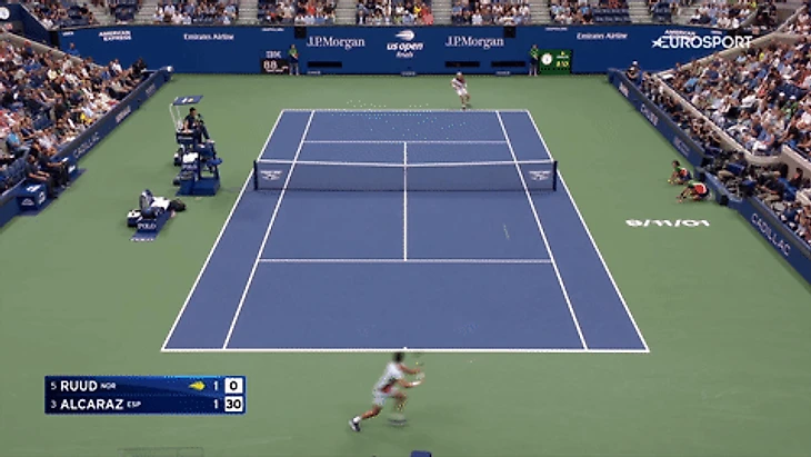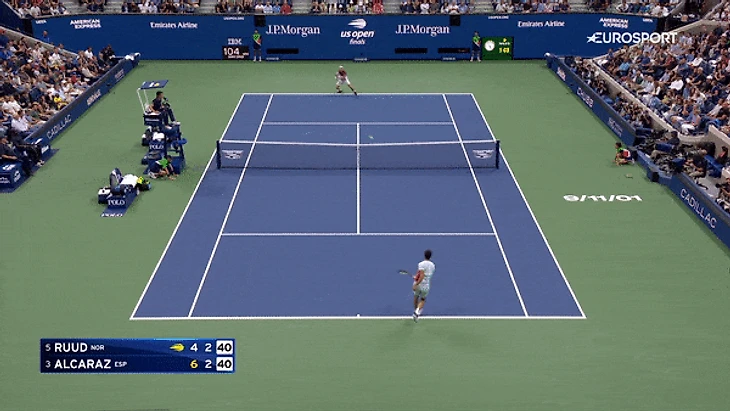 При счете 30:30 мощный размен. Рууд придавил Алькараса в левый угол, но тот оттуда вырвался, начал двигать норвежца по задней и выжал ошибку справа.