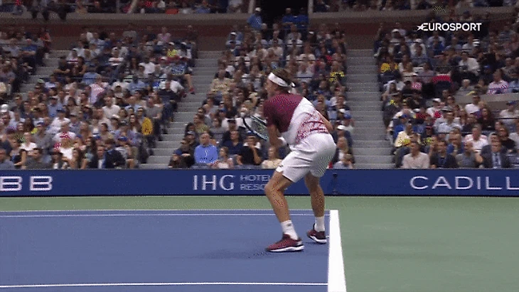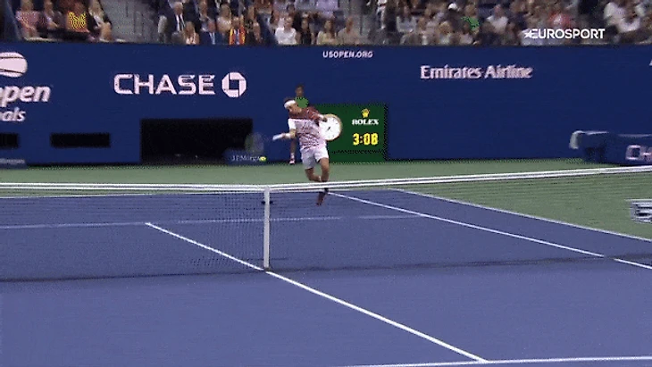 Потом не принял подачу, но при счете 15:15 глубоко принял подачу, выжал короткий ответ и вколотил бэкхенд.