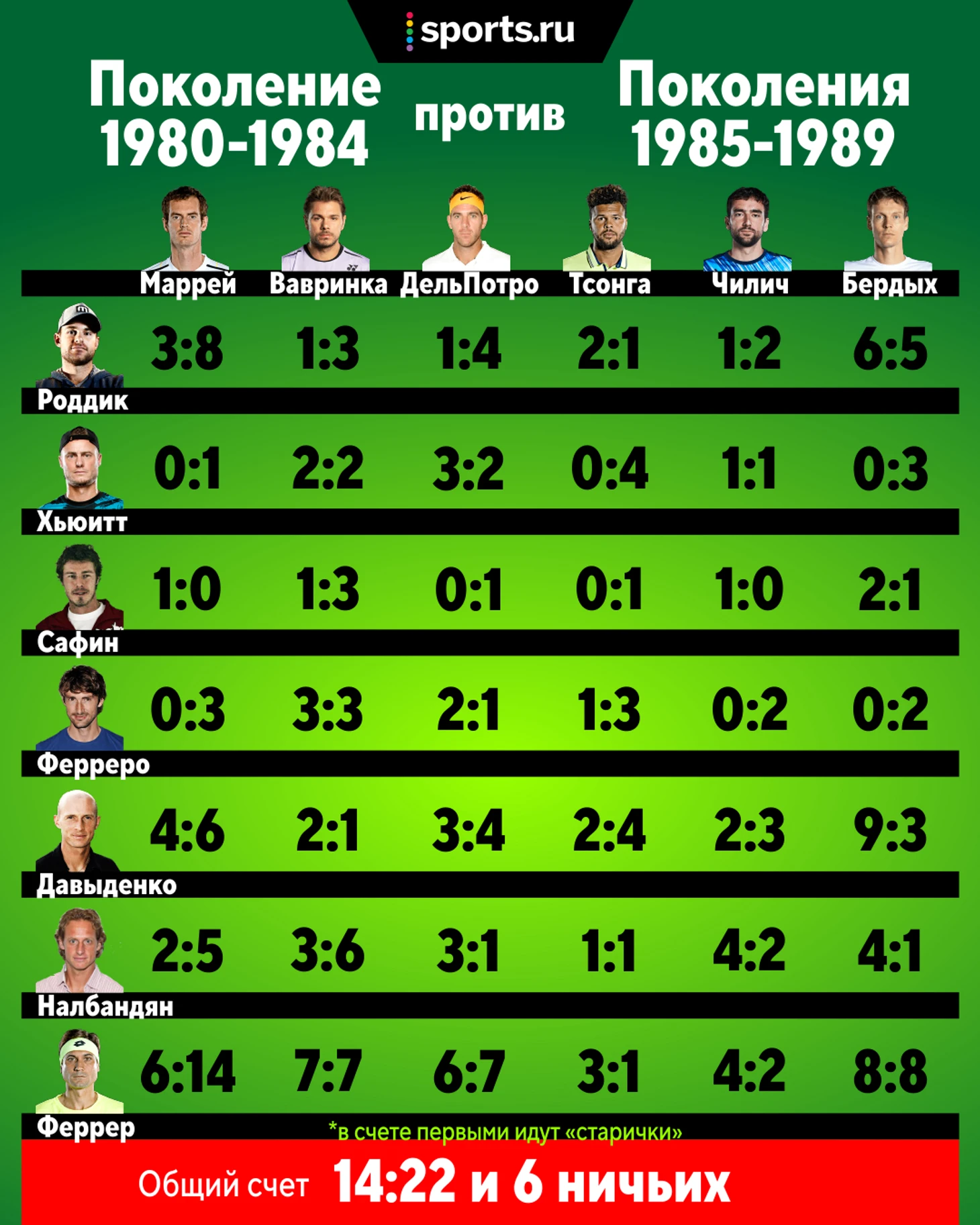 Есть еще один метод оценки: сравним личку лучших игроков поколения Федерера (1980-1984 годы рождения) с поколением Надаля и Джоковича (1985-1989 годы рождения). Саму Большую тройку при этом исключим, чтобы оценить, насколько второй эшелон сравним друг с другом.