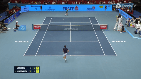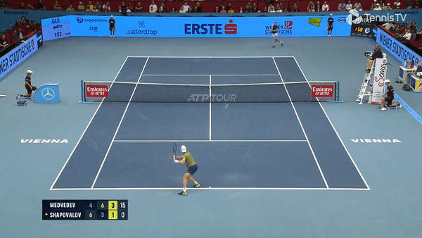 Медведев сейчас настолько уверенно контролирует мяч, что попадает феерические удары, даже когда бьет чуть ли не ободом. Перед тем, как праздновать эту красоту, он извинился перед соперником за везение.
