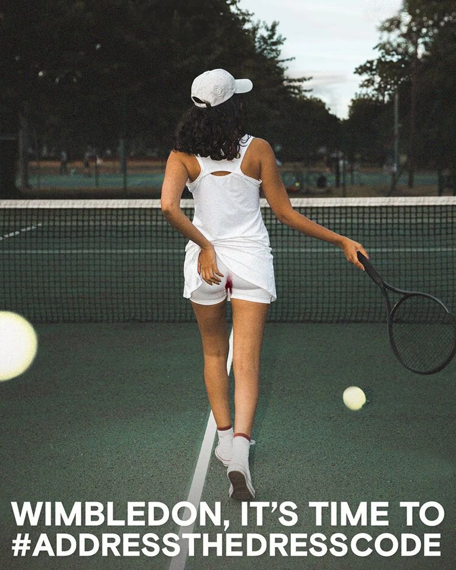 Афиша кампании интерпретировала легендарный постер 1976 года, на котором девушка в теннисной форме показывает попу, – только героиня-2022 не без белья, а в шортах, испачканных кровью. Небольшая акция протеста даже прошла в офлайне в день женского финала: активисты с большой растяжкой «Address The Dress Code» и парой плакатов поменьше («About Bloody Time») позировали перед входом на Центральный корт.