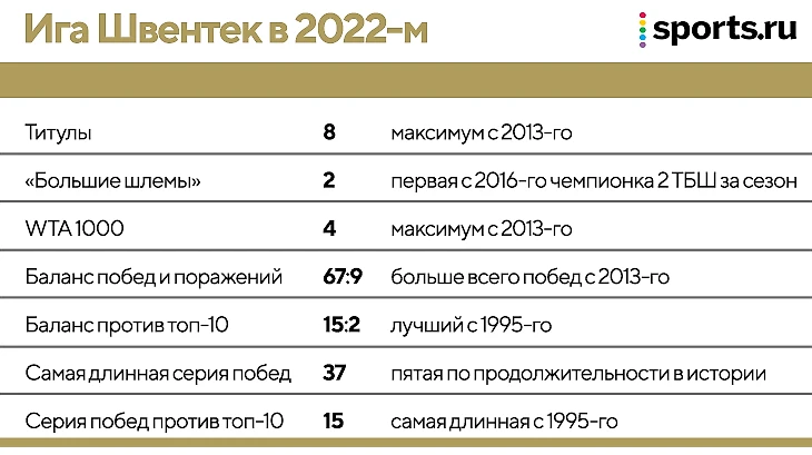 Первая ракетка мира Ига Швентек провела исторический сезон. Статистика говорит сама за себя.