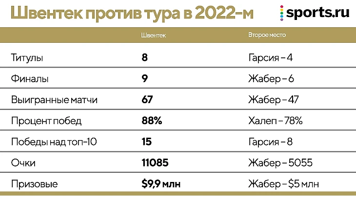 Если сравнивать польку с нынешним туром, то картина доминирования вообще потрясающая – почти по всем основным показателям она обходит соперниц в два раза.