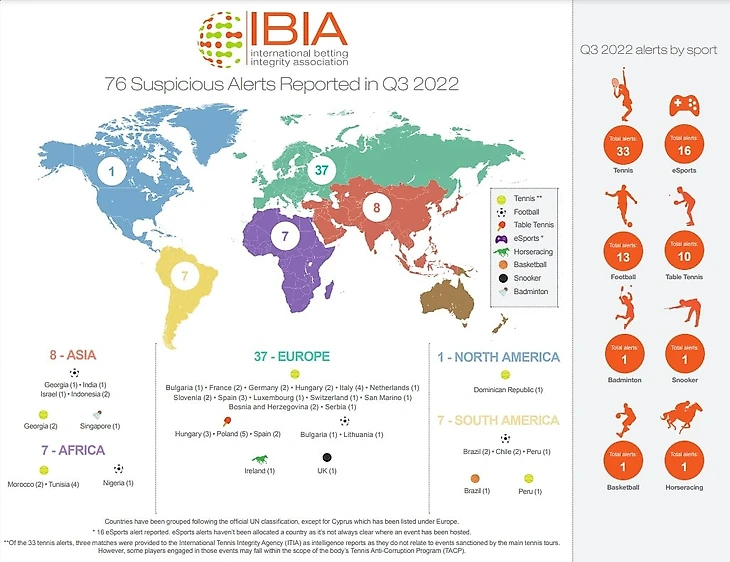 На мониторинг платформе AiBety вышел очередной отчет IBIA , который показывает количество подозрительных матчей. Данная информация поступает от операторов (букмекеров) , и туда попадают все матчи на которые сделаны аномальные ставки . Согласно отчету, теннис продолжает лидировать в этом антирейтинге, за последние 3 месяца сыграно 39 подобных матчей по которым идут расследования в правоохранительных органах тех стран , где проводились турниры.