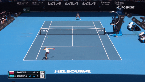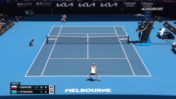В игре Рыбакина демонстрирует коронное хладнокровие и агрессивную дисциплину. Например, оцените розыгрыш из матча со Швентек.