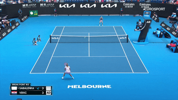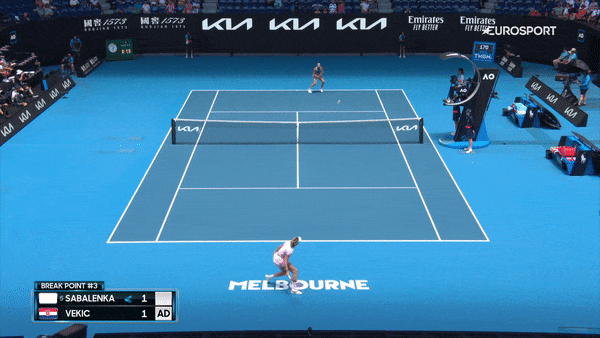 Когда белоруска подавала на сет, она отыграла еще брейк-пойнт, и там ей повезло – Векич посадила ее в оборону с приема второй подачи и чуть не попала атакующий форхенд по ширине.