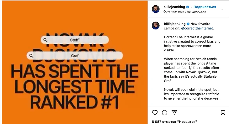 «Новая агитация: @correcttheinternet. Исправьте интернет - это глобальная инициатива, созданная для исправления предвзятости и помощи в том, чтобы сделать спортсменок более заметными. При поиске «какой теннисист провел больше всего времени на первом месте», результаты часто выдают имя Новака Джоковича, но факты говорят о том, что на самом деле это Штеффи Граф», - написала Кинг.