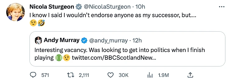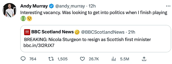 Энди Маррей и Никола Стерджен устроили любопытную переписку в Твиттере, после того, как теннисист отреагировал на отставку Стерджен с поста первого министра Шотландии.